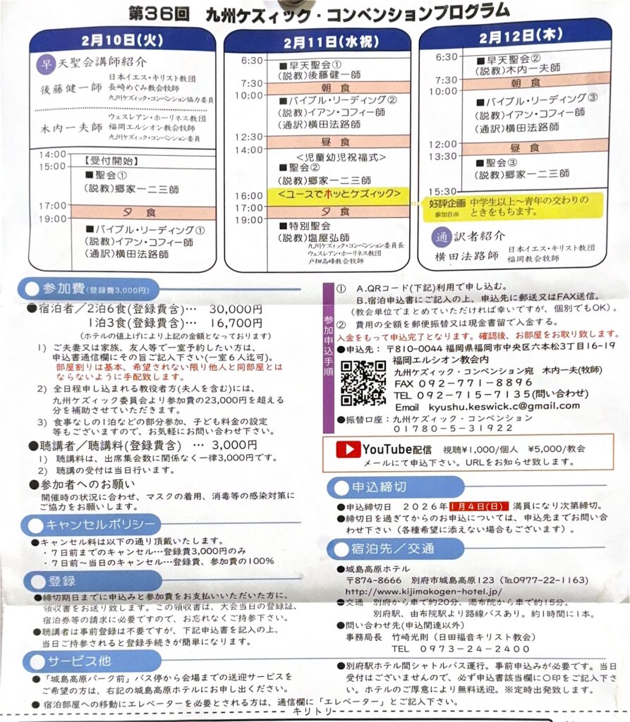 2026-2-10 第36回 九州ケズィック・コンベンションのご案内 2026 2/10 未分類 2026年2月10日 当日参加も可能です。お近くの方はぜひご参加下さい。恵まれた時となりますように。 未分類 この記事が気に入ったら いいねしてね! よかったらシェアしてね! URLをコピーしました! URLをコピーしました! 2026-2-8聖日礼拝休会のお知らせ この記事を書いた人 eikou 関連記事 2026-2-8聖日礼拝休会のお知らせ 2026年2月7日 講壇交換礼拝は祝されました。 Youtubeからご覧ください 2026年1月18日 クリスマス礼拝のご案内 2025年12月17日 2025クリスマス集会のご案内 2025年11月30日 11/24 教会バサーのお知らせ 2025年11月24日 YOUTUBE配信についてのお知らせ 2025年11月2日 9/14 礼拝の中で証し、フルートによる特別賛美が奉げられます。 2025年8月31日 イースター礼拝(教会学校合同)4月20日 午前10時15分 2025年4月18日 コメント コメントする コメントをキャンセルコメント ※ 名前 ※ メール ※ サイト 次回のコメントで使用するためブラウザーに自分の名前、メールアドレス、サイトを保存する。