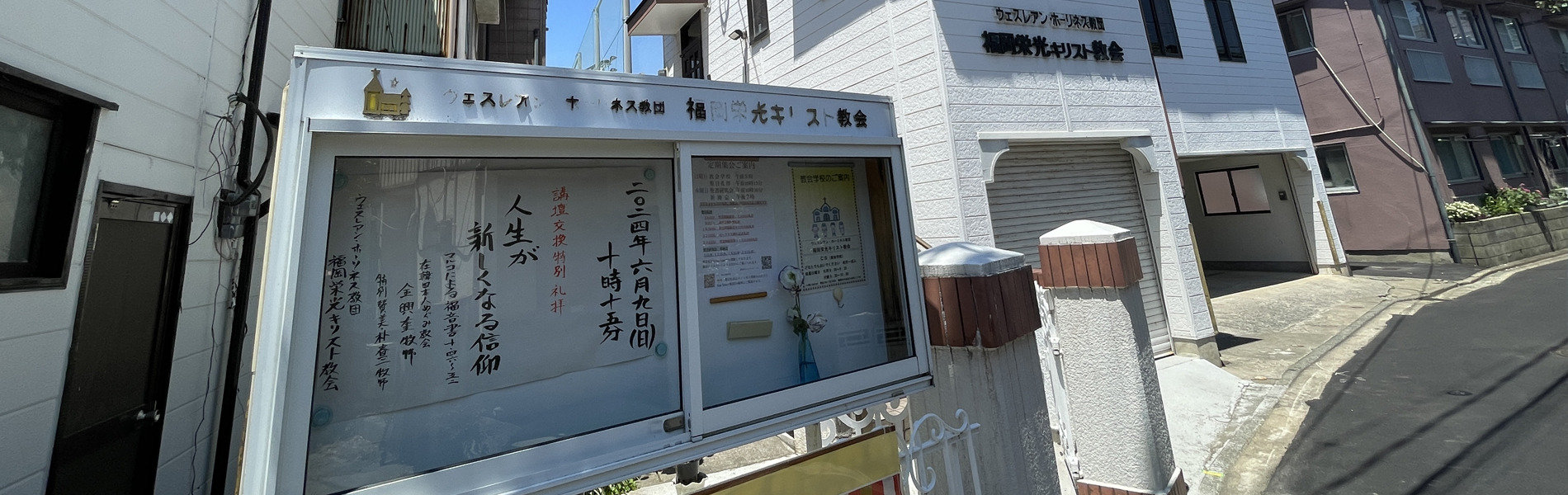 ようこそ、福岡栄光キリスト教会教会へ! 私たちの教会は、創立87年を迎えた聖書的プロテスタントのキリスト教会です。私達の所属している教団は、ウェスレアン・ホーリネスという名前の通り、ウェスレアン(ジョン・ウェスレーの信仰に生きる人)であり、ホーリネス(聖め)の信仰に基づく教団です。日曜日の朝10時15分からの礼拝に、ぜひご参加ください。皆様の来会をお待ちしております。
